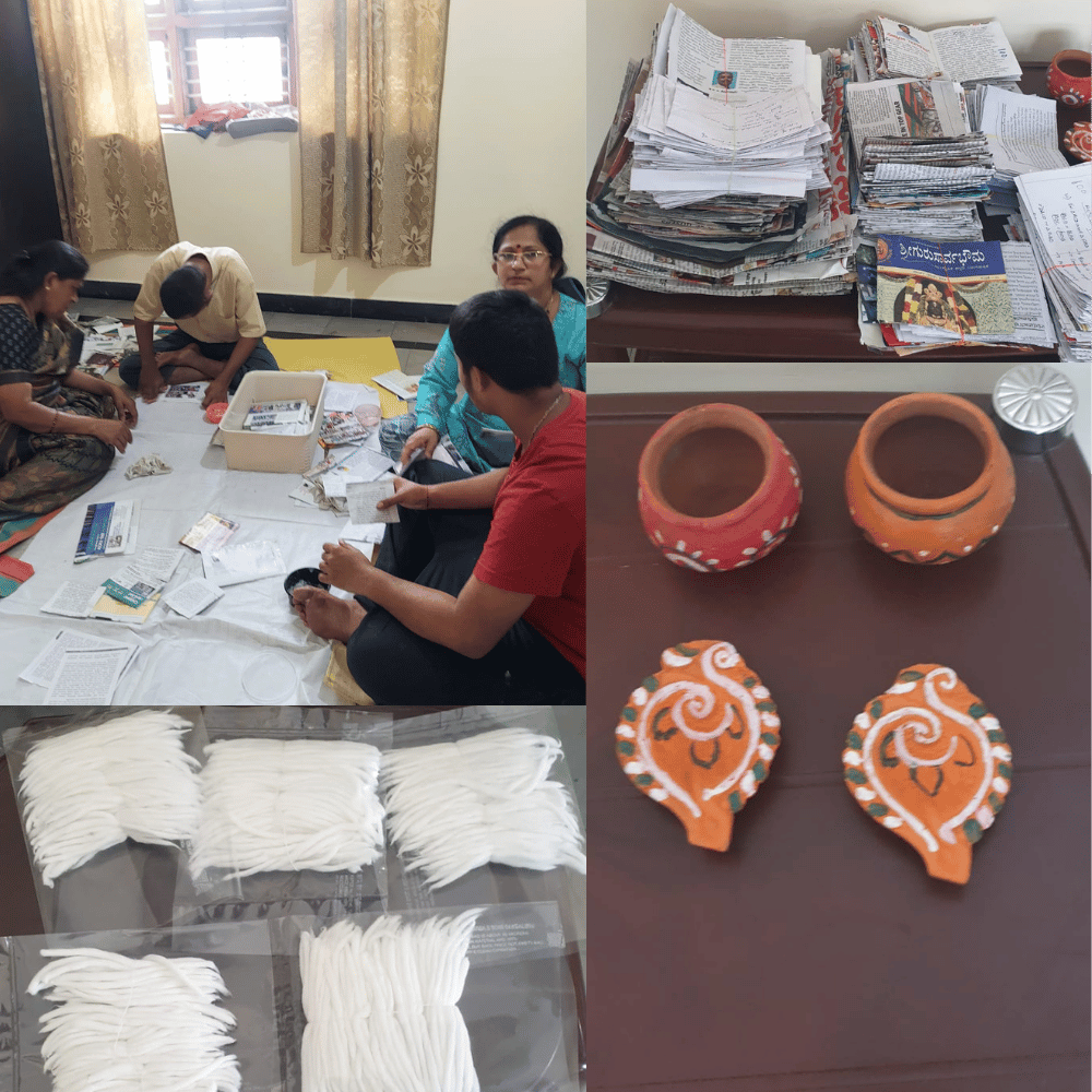 Painting of mud diyas in colourful hues, which can be sold in local markets on various occasions is another vocational training we like to provide.